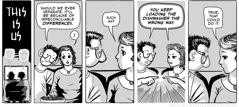 We really have serious issues with the dishwasher. When my wife loads it, everything is fine. When I load it, everything is fine. When one of us tries to complete the others' task, calamity ensues.